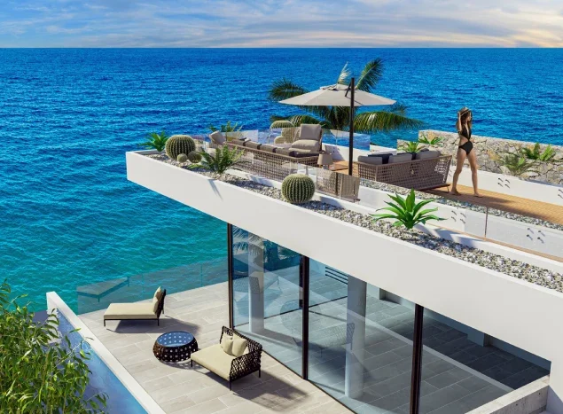 The 8 exclusive villas on the front facade are located on the edge of the rocky cliff, and when viewed from afar, they feel like they are on the sea. While the view of the villas from the private road at the back is a single-storey bungalow, the bedroom floors are actually located under the living areas and the pool at the road level. The roof terrace is the finishing touch with 360-degree sea and mountain views at the back, while the 3 en-suite bedrooms with walk-in closets open in front of the sea to a love garden with stunning sea views inside and out.